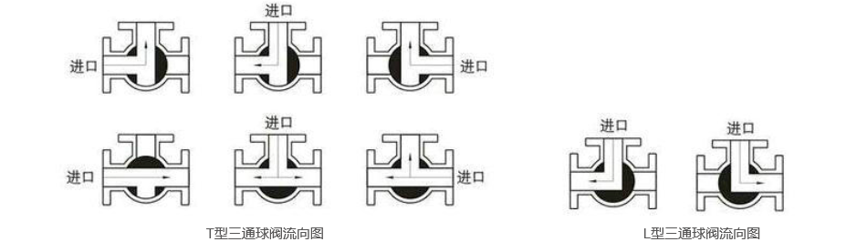 氣動三通球閥根據(jù)結構形式及流通方向不同分為L型和T型,介質(zhì)流通方向圖如下。 |