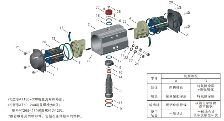 以上為標(biāo)準(zhǔn)型的傳動(dòng)原理。根據(jù)用戶需求,氣動(dòng)執(zhí)行器可裝置成與標(biāo)準(zhǔn)型相反的傳動(dòng)原理,即選準(zhǔn)軸順時(shí)針方向轉(zhuǎn)動(dòng)為開啟閥門,逆時(shí)針方向轉(zhuǎn)動(dòng)為關(guān)閉閥門。單作用(彈簧復(fù)位型)氣動(dòng)執(zhí)行器A管咀為進(jìn)氣口,B管咀為排氣孔(B管咀應(yīng)安裝消聲器)。A管咀進(jìn)氣為開啟閥門,斷氣時(shí)靠彈簧力關(guān)閉閥門。